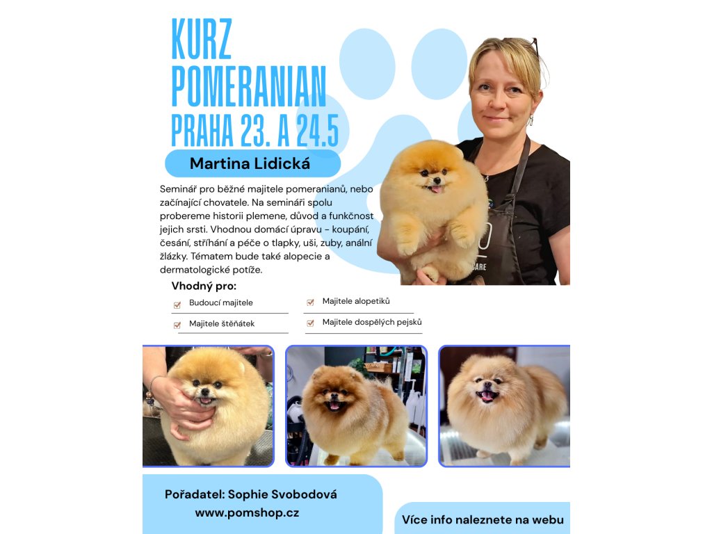 Seminář je sestavený z pohledu profesionálního groomera, Martiny Lidické, která vychází z reálných problémů, se kterými se denně setkává ve svém salonu, a zároveň z pohledu chovatele, Sophie Svobodové, která ví, v čem majitelé pomeranianů nejčastěji tápou doma. Díky této kombinaci je seminář velmi praktický, srozumitelný a zaměřený na skutečné situace, které majitelé řeší. Součástí semináře je také péče o pejsky s alopecií. Budeme se věnovat tomu, jak tomuto problému předcházet, jak rozpoznat první varovné signály, co může alopecii spustit a jak správně nastavit péči tak, aby kůže netrpěla a srst měla šanci znovu růst. Probereme si také nejčastější kožní parazity a dermatologické problémy, jako jsou kvasinky či plísně, se kterými se pomeraniani velmi často potýkají.